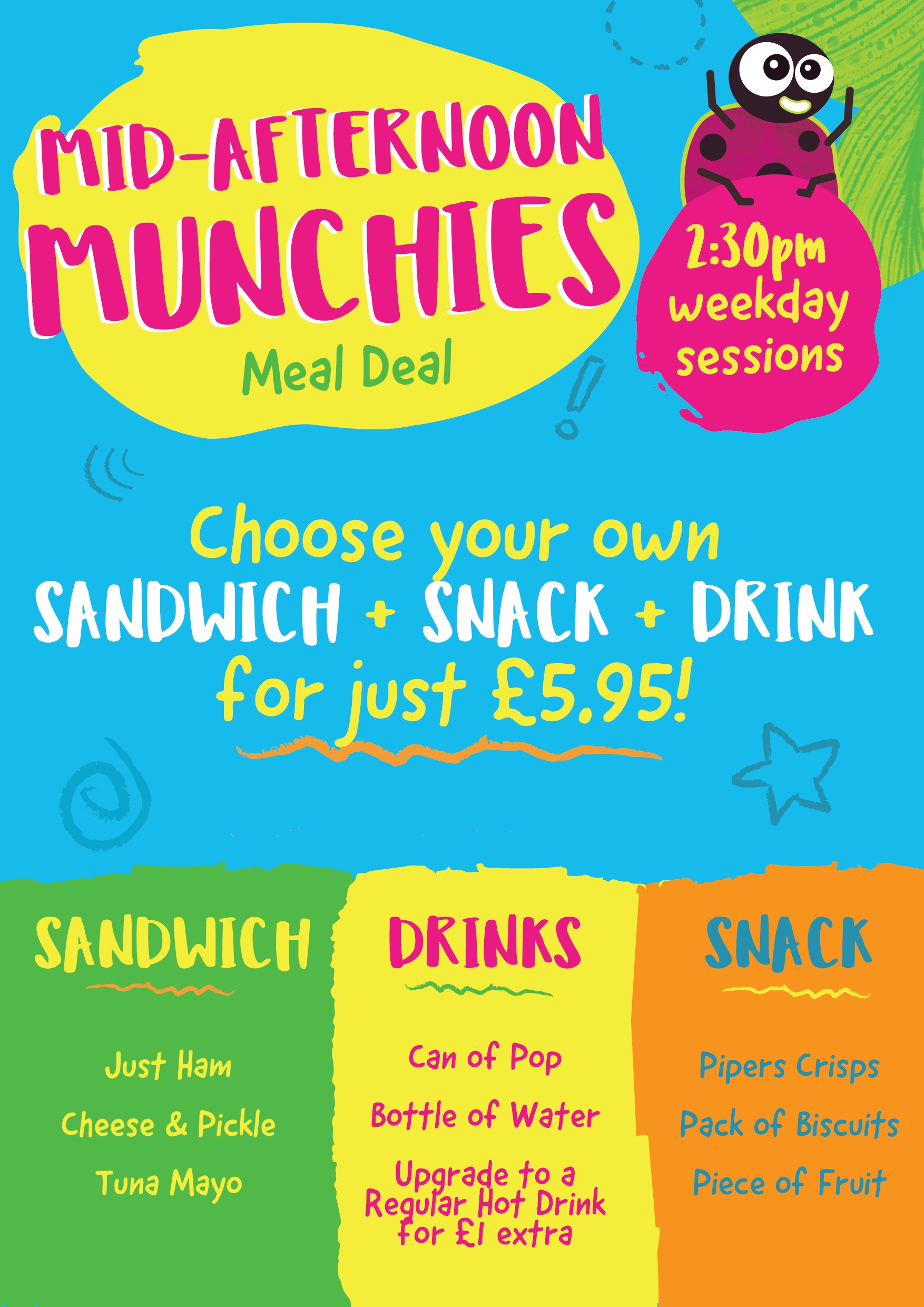 While the kids let off steam, grown-ups can tuck into our brand new Mid Afternoon Munchies Meal Deal for just £5.95! Mix and match all of your favourites…